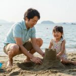 朝焼けのビーチを家族で散歩、昼は浜でサザエやタコの観察に夢中。